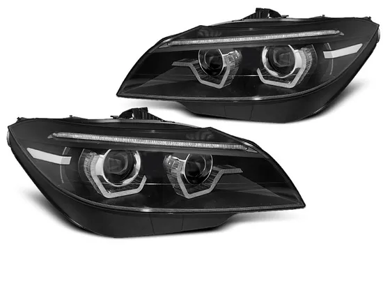 Передние фары для BMW Z4 E89 (09-13) Год выпуска автомобиля: 2009-2013 Цвет: черный Для автомобилей со штатным ксеноном (для установки необходимо переставить из родных фар блоки розжига и лампы ближнего света). Для автомобилей без AFS (адаптивной системы освещения). Регулировка света: электрокорректор (приводы включены в комплект). Габаритные огни: LED 3D ангельские глазки. Указатели поворота: LED (динамические). Ближний и дальний свет: D1S (лампа не включена в комплект). В комплект входят 2 фары.