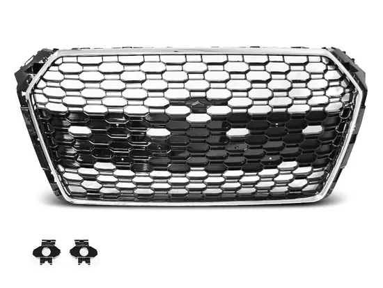 Решетка радиатора Tuning-Tec для AUDI A4 B9 (15-19), черная глянцевая с хромированной окантовкой в стиле RS4. Подходит на стандартный бампер, S-line, S4, НЕ подходит для RS4. Возможна установка камеры переднего обзора и датчиков парковки. Решетка изготовлена из современного высококачественного ABS пластика. Устанавливается на штатные крепления без какой-либо доработки или подгонки. В комплект входят 1 решетка радиатора, площадка для крепления номерного знака, площадка для крепления логотипа, крепления датчиков парковки, заглушка под камеру.